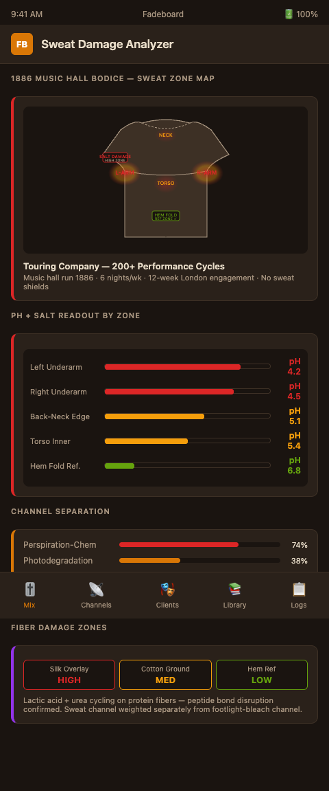 If your archive holds touring wardrobe with accumulated perspiration damage from multi-night runs, and you are preparing the pieces for exhibit or production loan, Fadeboard can build a channel-separated degradation model that distinguishes sweat chemistry from light exposure before any treatment decisions are made.