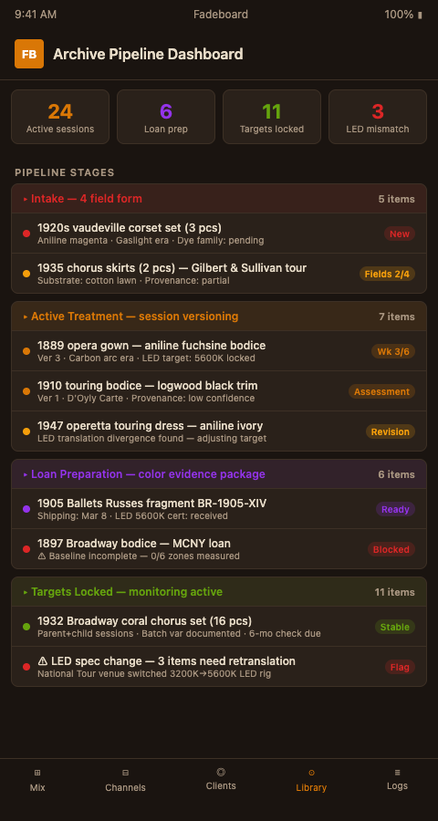 That last point reflects a real operational challenge: LED adoption in performance and exhibition venues has accelerated substantially, and costumes whose loan documentation was prepared against a 3200K tungsten Fresnel specification may read incorrectly under the 5600K LED rig they now travel to. A well-maintained Fadeboard pipeline flags those mismatches at the session level rather than discovering them after the piece has already traveled.