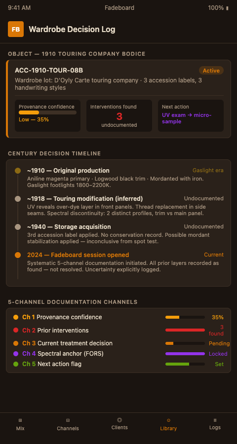 The value of Fadeboard in this context is not primarily analytical — it is documentary. A Fadeboard session for a century-old wardrobe piece creates a structured record of every decision, the evidence that supported it, and the uncertainty that remained unresolved. That record becomes an object file entry that any future conservator can read, challenge, and build on.