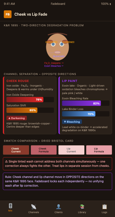 This is where Fadeboard's independent fader model resolves what a single-color approach cannot. You set a separate degradation channel for cheek rouge (typically trending toward warm darkening) and a separate channel for lip paint (trending toward pale bleaching or, if vermilion, toward dark-brown shift). The channels move in opposite directions. Mixing a single wash to address both is physically impossible — one correction always fights the other.