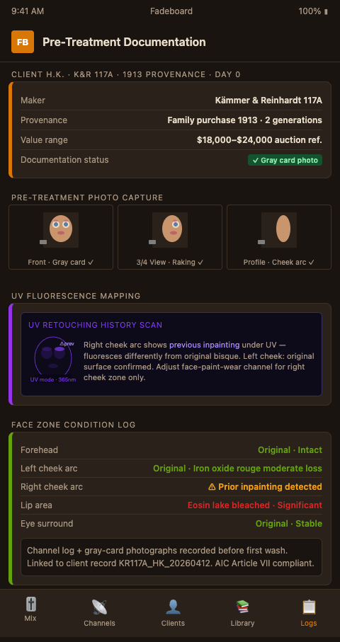 Independent doll restorers handling heirloom bisque under eleven-day deadlines cannot afford the time documentation takes — until a client dispute makes clear they cannot afford its absence. Fadeboard's channel log converts your pre-treatment photographic record from a folder of images into an auditable history: each channel setting traces back to a documented condition state, and every mixing decision is grounded in that record.