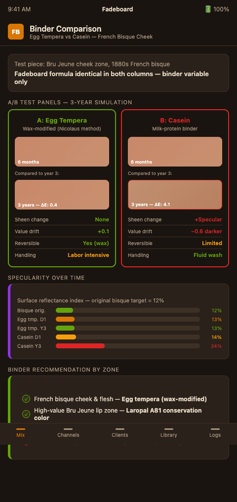 If you're currently using casein on bisque cheek zones because it handles more like gouache, run a comparison test against egg tempera on a sacrificial shard. Place both test panels on a windowsill for 30 days and compare them against your original reference under raking light at the end. What you observe will make the binder decision straightforward — not because theory says one is better, but because you will see the specularity difference developing in real time. Let Fadeboard calibrate the formula; then choose the binder that keeps that calibration intact.