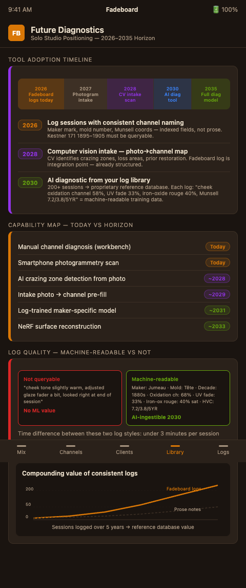 For Fadeboard users, the implication is that the channel-log architecture created today will be the training data and the integration point for those tools when they arrive. A studio with 200 logged sessions organized by maker, decade, material type, and degradation channel is positioned to use an AI diagnostic tool the moment it becomes available — because the log structure is already compatible with how those tools ingest and interpret color and condition data. The solo studio scaling workflow architecture is the specific foundation that makes future tool adoption seamless — a systematized intake, session-log, and post-treatment record structure enables new diagnostic capability integration without requiring workflow reconstruction from scratch.