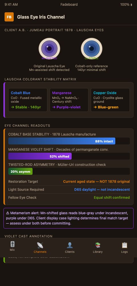 Fadeboard's glass-eye channel gives independent restorers a structured framework for this kind of colorant-shift reasoning without lab infrastructure. If you currently manage glass eye matching by eye under a single lamp and have had clients report color mismatch under their display lighting, the waitlist is open now. Join and note which maker's eye glass — Lauscha standard, Müller-Uri twisted rod, or French enamel-on-crystal — gives you the most consistent trouble, and that input will shape the first manufacturer-specific channel calibrations in the early-access build.