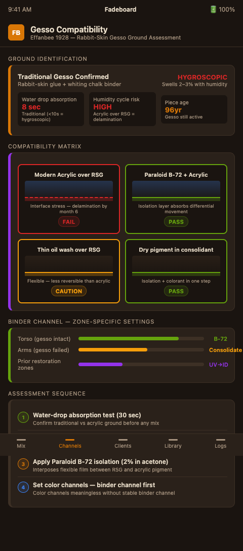 In Fadeboard's channel framework, the gesso ground compatibility assessment feeds directly into the binder-selection channel — an often-overlooked channel that operates in parallel with color channels. The binder channel setting determines which vehicle is used to carry the pigment: pure acrylic medium over isolated gesso, conservation wax over non-isolated gesso, or dry pigment in a diluted consolidant where the isolation function and the colorant function are combined in a single application. The insurance appraisal documentation is directly relevant here: gesso compatibility assessment results and isolation treatment records are material information for any formal appraisal of a restored composition piece — a documented treatment record that notes "Paraloid B-72 isolation layer applied before pigment" is meaningfully different from one that simply notes "color restored."