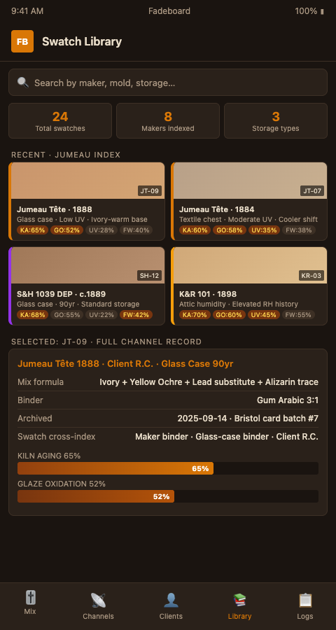 The Fadeboard waitlist is open for independent restorers who want to start building a structured swatch library now, before the next eleven-day deadline arrives. Join with a note on how many makers you encounter regularly in your studio — Kestner, Jumeau, S&H, K&R, Bru — and the early-access release will include maker-indexed channel presets that give your first swatch cards a professionally grounded starting configuration.