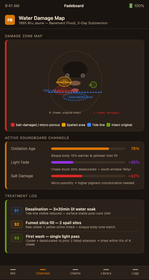 If a recent water event has left you facing a similar tide-line situation on a French bisque piece, Fadeboard's desalination-to-pigment workflow gives you a reproducible sequence from substrate prep through final documentation. Start with the oxidation and damage channels before you touch the color faders, and the first wash will tell you whether you're on target rather than leaving you to find out after the third.