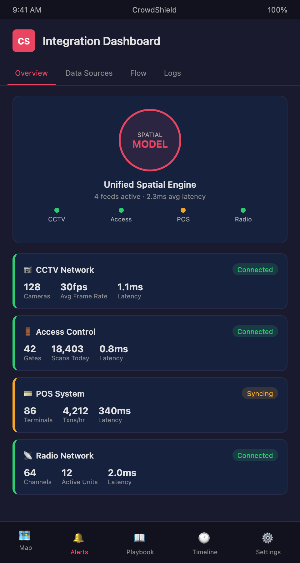 Walk into any modern stadium's security command center and you'll see the same layout: a wall of CCTV monitors, a radio dispatch console, a separate screen for access-control turnstile counts, and — somewhere on a clipboard or spreadsheet — the incident log from last week's game. Each system works. None of them collaborate.