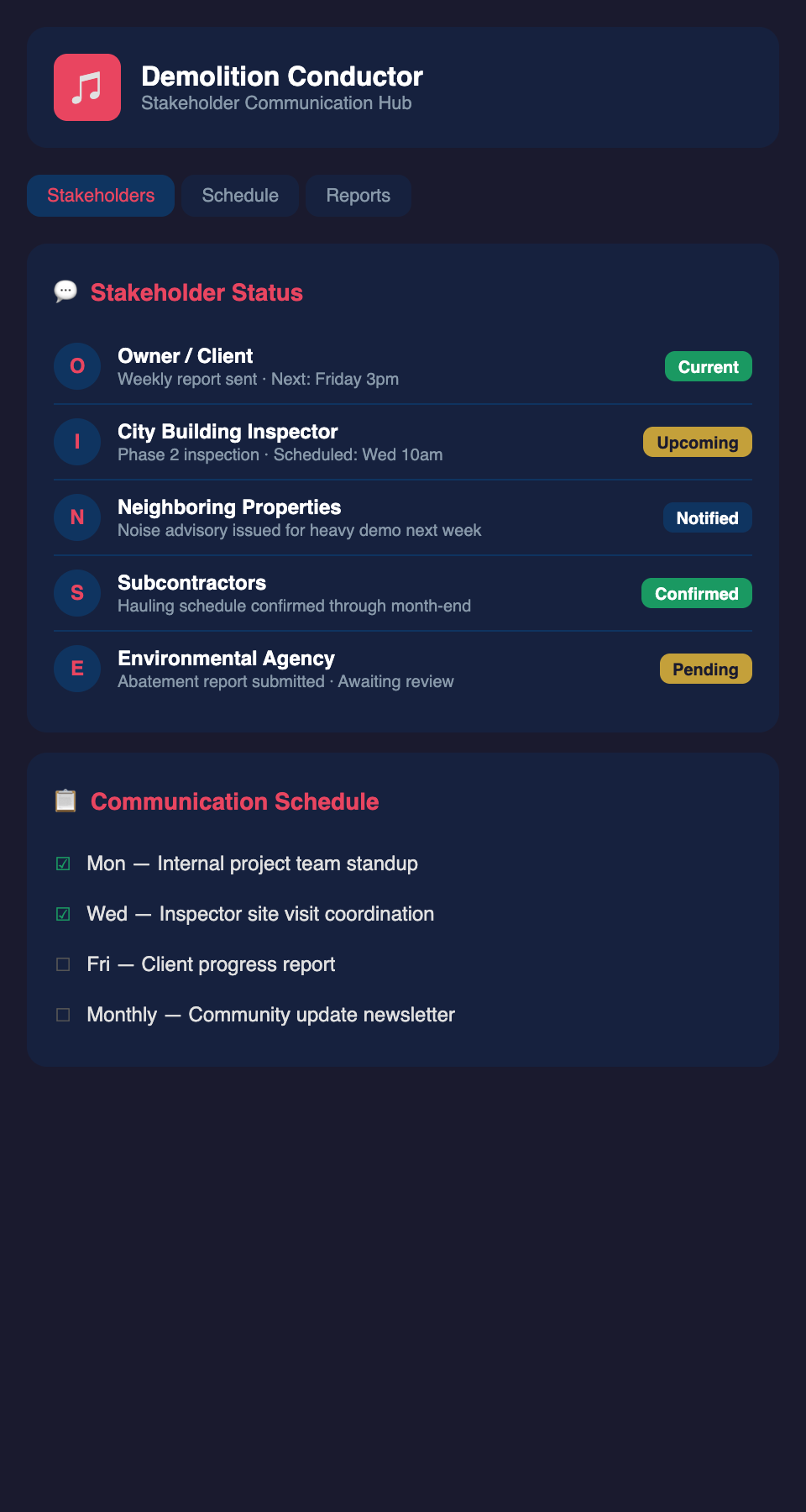 Effective demolition communication addresses both the technical project status and the stakeholder concerns underlying it.