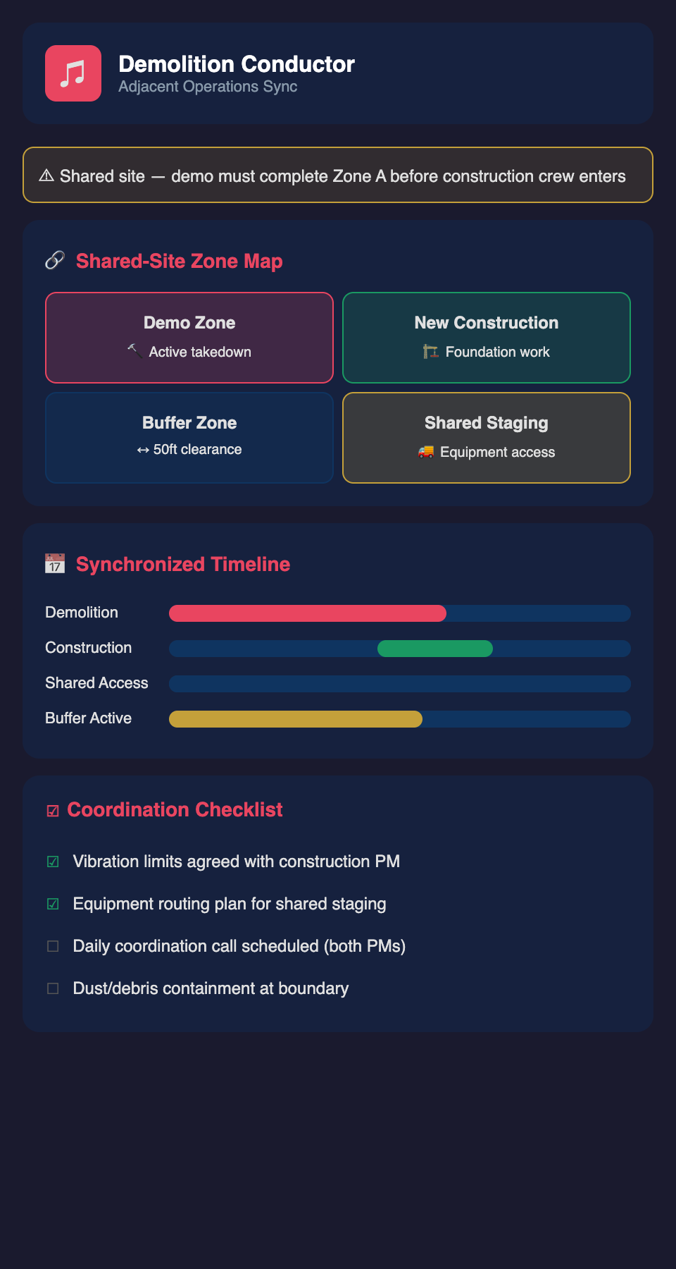 The fundamental challenge is that demolition has inherent properties that conflict with parallel operations: vibration, dust, noise, equipment movement, and unpredictable sequences. Meanwhile, adjacent operations require stability, clean conditions, defined schedules, and safe working environments. Managing the intersection of these conflicting needs demands explicit coordination protocols and architectural understanding of how operations truly affect each other.