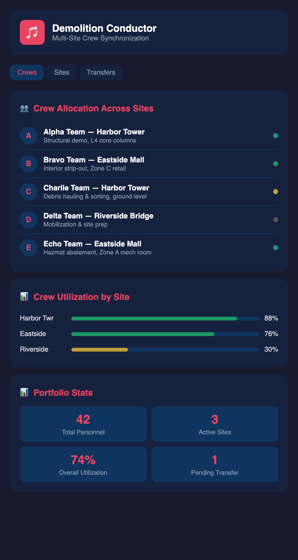 Yet most demolition firms manage crew allocation using email, spreadsheets, and informal conversations. This approach works for 2-3 projects but breaks down at scale.