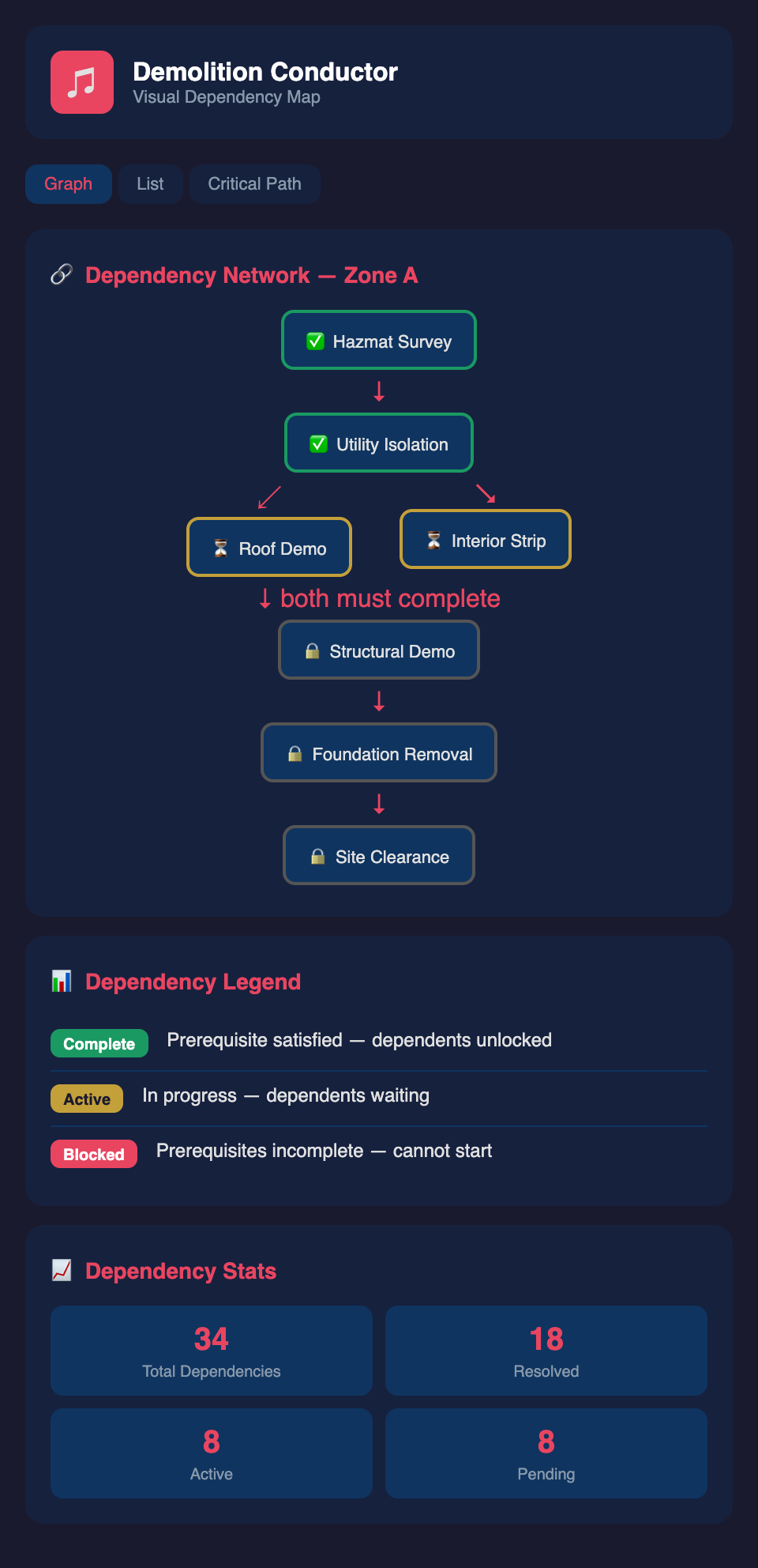 A 400-task demolition project has hundreds of dependencies. Task 47 (install temporary support) enables Task 52 (remove central column), which enables Tasks 89-104 (interior demolition). Task 187 (hazmat clearance) blocks multiple parallel streams of work. Without visualization, these relationships exist only in document spreadsheets and project manager heads.