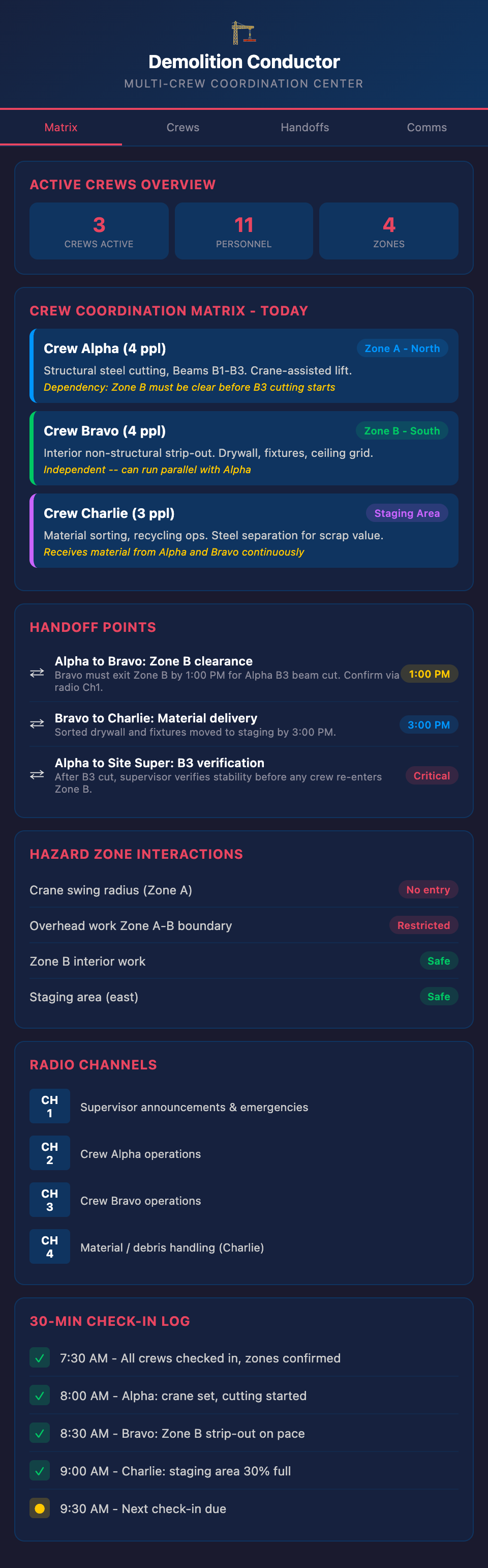 Update this matrix daily. Site conditions change. A structural element may need reinforcement before removal. A material delivery may delay a phase. Crews must know about changes before they create hazards.