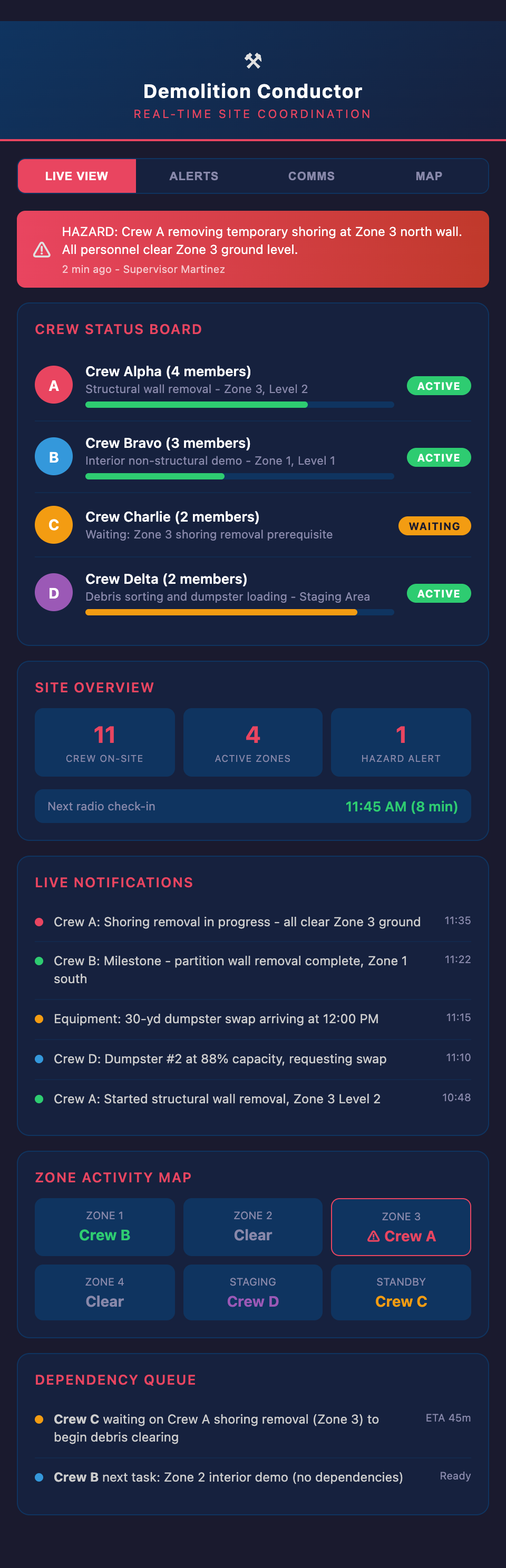 Demolition sites change by the minute. A crew finishes removing a wall early, creating a hazard for another crew working in the load path. An element takes longer than expected, delaying the next phase. Equipment delivery arrives earlier than scheduled. A safety hazard appears requiring immediate attention.
