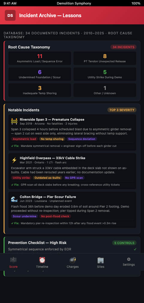 Post-incident score review as a planning improvement cycle. When a bridge demolition project experiences an unexpected event — not necessarily a collapse, but any unplanned structural behavior — the Demolition Symphony Planner's score audit trail provides the documentation for root cause analysis. The sequence of measures, the gate confirmations, the sensor readings, and the condition updates are all timestamped in the score record. Root cause analysis for bridge demolition incidents consistently finds, as documented across OSHA investigation reports, that the gap between plan and execution is the primary failure mechanism. A score-based plan with an audit trail makes that gap visible after the fact — and preventable before it.