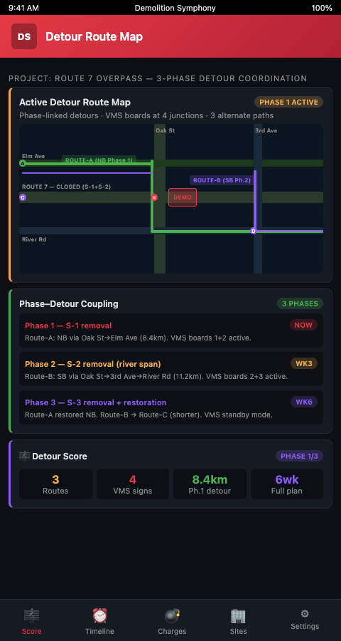 The Demolition Symphony Planner treats detour routes as a parallel score track running alongside the structural demolition sequence. Just as an orchestral score shows multiple instrument lines playing simultaneously — each dependent on the others — the demolition score shows the structural phase track and the detour activation track advancing together. A structural measure that closes the bridge deck can only play when the corresponding detour activation measure has already run.