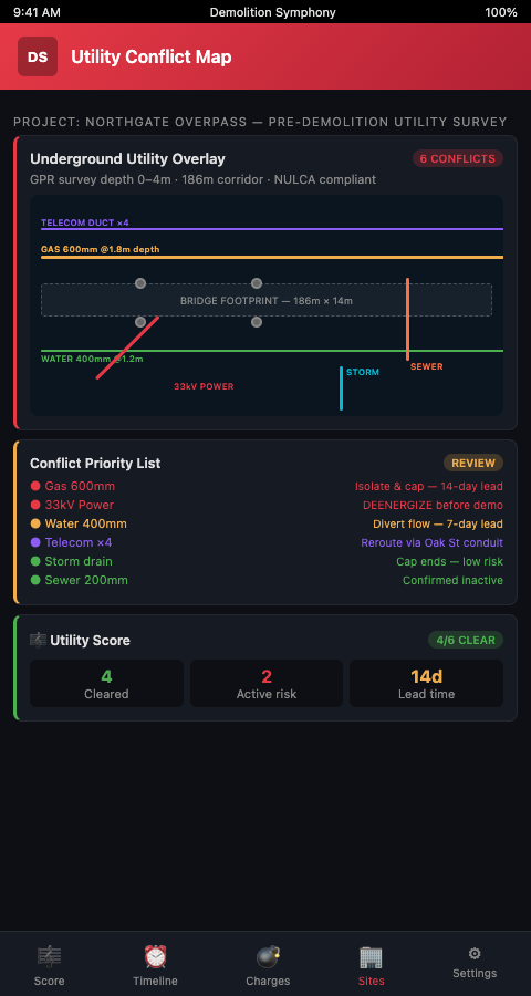 Pre-demolition utility locating for overpass projects also creates the legal record that utility conflict claims require. When a utility owner alleges that demolition activities damaged an infrastructure line, the project team's pre-demolition survey documentation — embedded in the score as the baseline against which protective cues were set — is the primary defense. A utility conflict resolution record that shows when each utility was identified, what protection was specified, and when that protection was confirmed in place provides the defensible record that verbal survey notes cannot. Underground utility survey records for bridge demo projects that are managed through the Demolition Symphony Planner are automatically structured as project documentation, not as field notes that may or may not survive the project lifecycle.