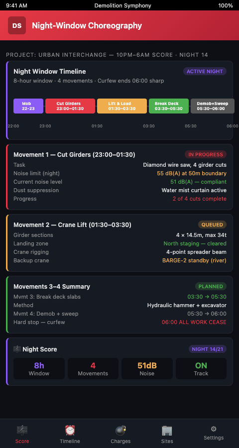 Bridge and overpass demolition teams working in urban corridors need a night-window plan that holds up under real conditions: compressed time, noise constraints, crew fatigue, and a hard reopening deadline that traffic enforces whether the work is finished or not. Score your overnight overpass removal with the Demolition Symphony Planner and give your bridge and overpass demolition team a pre-written night sequence — every measure defined, every noise-hold cue explicit, every fallback path documented — so no one is composing the plan at midnight when execution is the only job that matters.
