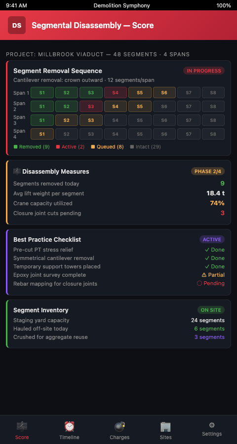 Bridge and overpass demolition teams working on segmental concrete structures need a planning instrument that reflects the actual complexity of match-cast joint geometry, post-tension state, and segment removal order — not a generic demolition timeline that treats the structure as a pile of uniform blocks. The Demolition Symphony Planner writes the reverse construction sequence as a visual, phase-gated score that every engineer and operator on the project can read and execute.