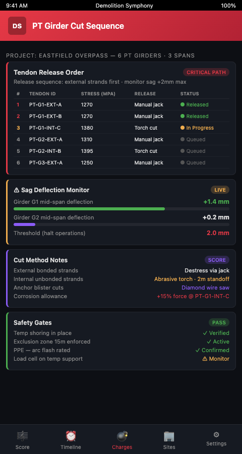 Connecting tendon sequencing to charge placement principles. Teams with explosive demolition experience will recognize that charge placement map development for steel frame buildings follows the same logic as tendon release sequencing: each structural element that is cut or fractured changes the load distribution in the remaining structure, and the cutting or fracturing order must account for those changes. The Demolition Symphony Planner uses the same gate notation architecture for both contexts — tendon release gates in prestressed demolition and charge sequence gates in explosive demolition are structurally equivalent planning events.