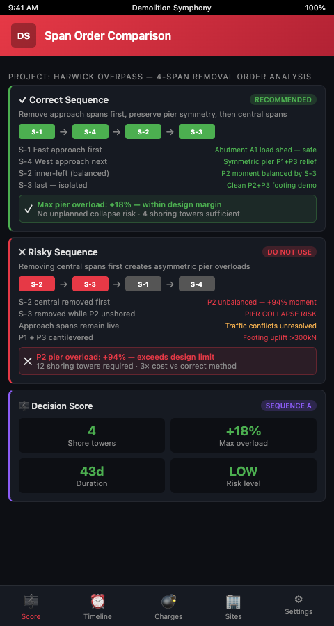 Score your span removal sequence with the Demolition Symphony Planner and give your bridge and overpass demolition team a critical span register, a validated reverse-construction default, and a structural check at every intermediate state — so your crane schedule is built on a sequence that engineering has confirmed safe at each step. Build your bridge span extraction strategy with the Demolition Symphony Planner before the first permit is filed.