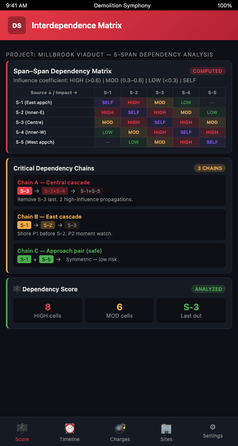 The Demolition Symphony Planner treats the coupling assessment as the first step of every multi-span bridge demolition project, not as a background document that gets filed with the project record. It is the key signature that every subsequent measure is written against.
