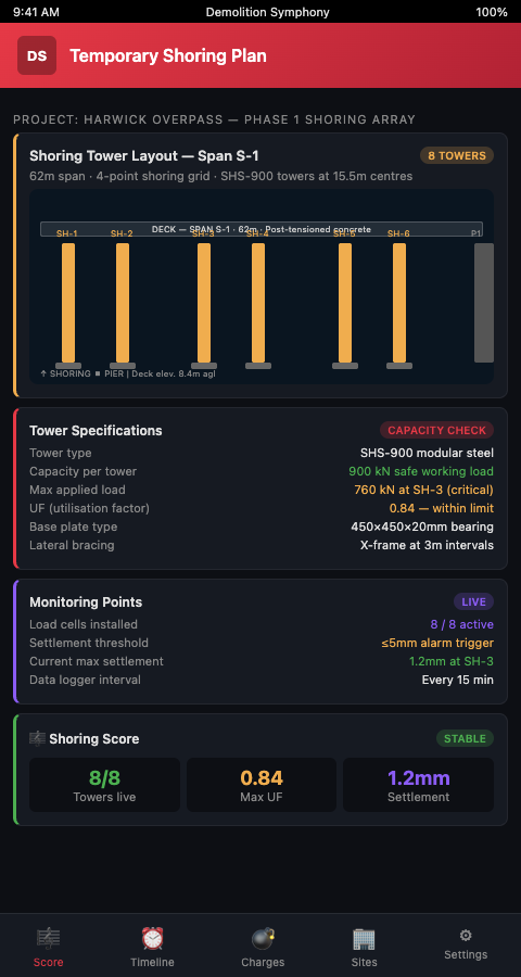 The Demolition Symphony Planner makes shoring a first-class element of the project score. It is designed, annotated, reviewed, and confirmed at every phase where it matters — not assumed and not improvised. The interim support structure notation in the score creates an auditable record: every shoring tower's design, placement, and load transfer confirmation is traceable through the measure-by-measure gate history, so the project team's compliance with temporary works specifications is documented in the same record as their structural sequencing decisions.