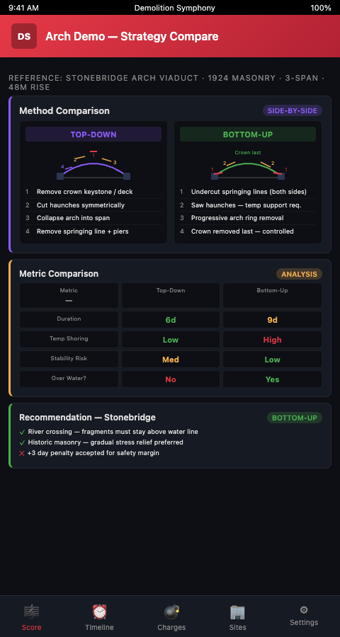 Bridge and overpass demolition teams working on arch structures face a strategy selection that commits the entire project. The Demolition Symphony Planner makes that selection explicit at the score's first movement, ensuring that every downstream measure is written against the correct structural logic for the chosen approach.