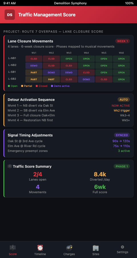 Road Closure Sequencing Mapped to Structural Events. California DOT TMP Guidelines note that full closures can minimize total project duration by allowing unrestricted equipment access, but only when timed correctly. The Demolition Symphony Planner writes full closure windows as bracketed measures — closed from measure 4 through measure 9, for example — with the structural work sequence visible within those brackets. If a measure runs long, the project team sees immediately that the closure window is at risk and can activate the contingency protocol written into the score.