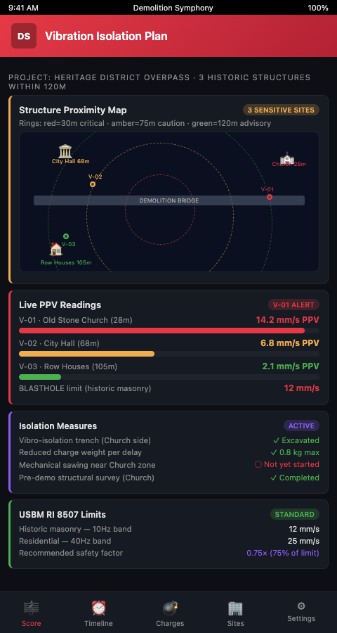 The NCHRP Task 72 case-by-case flexibility guidance acknowledges that vibration limits for historic structures require judgment beyond a single threshold value. The Demolition Symphony Planner provides the framework for that judgment to be applied systematically: the threshold is documented, the method constraint is explicit, the monitoring is continuous, and the gate is automatic. No individual decision in the field needs to carry the full weight of protecting an historic asset — the score carries it.