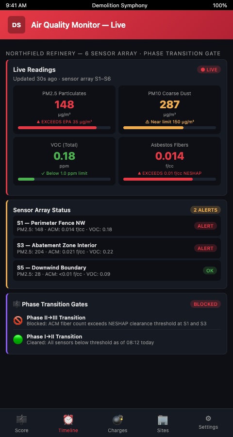 Demolition Symphony Planner treats air quality monitoring as a voice on the decommissioning score—not a separate inspection report that lives in a different file. Each phase transition between demolition voices (hazmat to extraction, extraction to structural, or any re-entry after a containment event) carries an embedded monitoring window that must resolve before the next voice is unlocked.