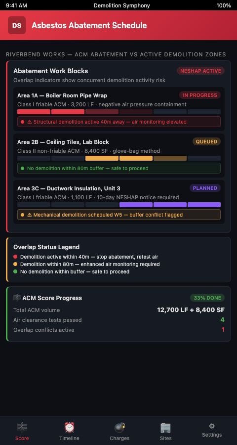 Sequence your abatement before demolition crews mobilize. Load your ACM survey results into Demolition Symphony Planner and generate the NESHAP-compliant asbestos sequencing plan with spatial separation buffers before your first concurrent-activity week. Start your asbestos sequencing plan now and get NESHAP notification windows, spatial separation buffers, and clearance gates mapped before any demolition crew enters an adjacent zone.
