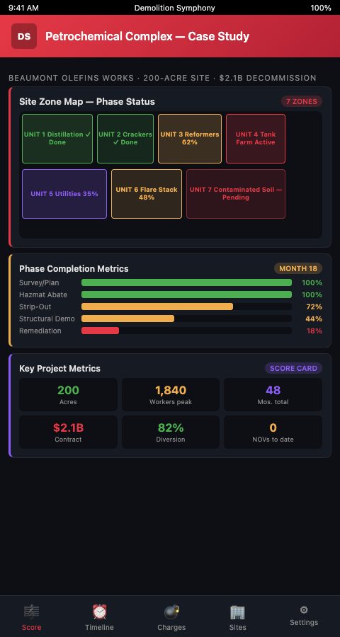The Demolition Symphony Planner treats a 200-acre petrochemical complex as a musical score with four primary voices: hazmat abatement, equipment extraction, utility isolation, and structural demolition. Each voice has its own tempo — abatement runs slower than structural, equipment extraction requires windows of structural access, utility isolation creates the preconditions for everything else. The visual score makes the interdependency legible: you cannot advance the structural demolition voice past measure 12 until the hazmat voice has cleared to measure 8, because the structural debris in that zone creates a contamination migration pathway into the abatement zone.