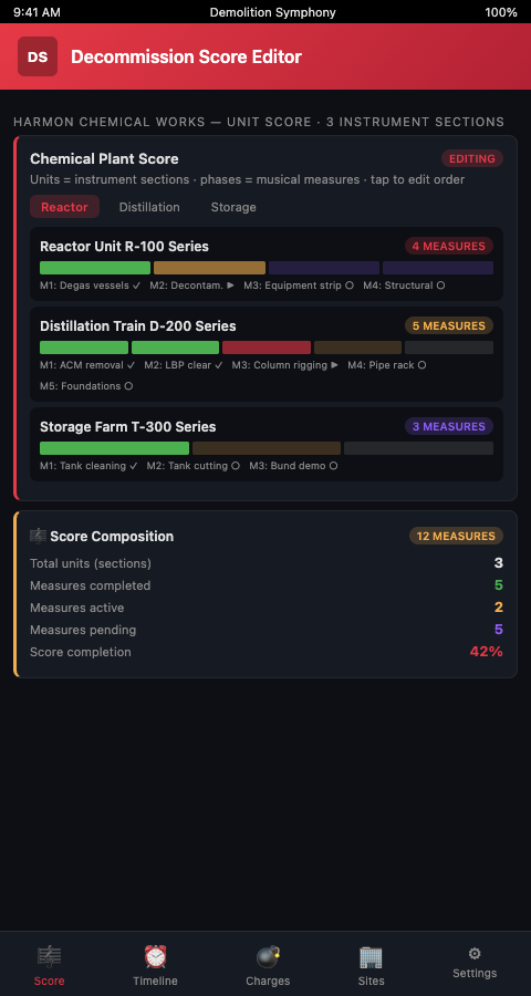Demolition Symphony Planner supports dynamic score updates: when field conditions reveal new complexity factors (additional ACM, structural deterioration, unexpected equipment), the affected zone's score is updated and the phase schedule adjusts automatically to reflect the revised buffer and sequencing requirements.