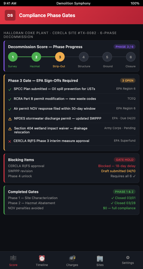Compliance verification before demolition phase transition is the structural mechanism that prevents the audit scenario AEI describes: the stop-work order that audits backward through everything done before it was issued. Demolition Symphony Planner prevents that scenario by ensuring that every phase begins with documented proof that the previous phase met its environmental obligations—proof that is attached to the project record, not filed separately in an environmental consultant's system the project manager cannot access.