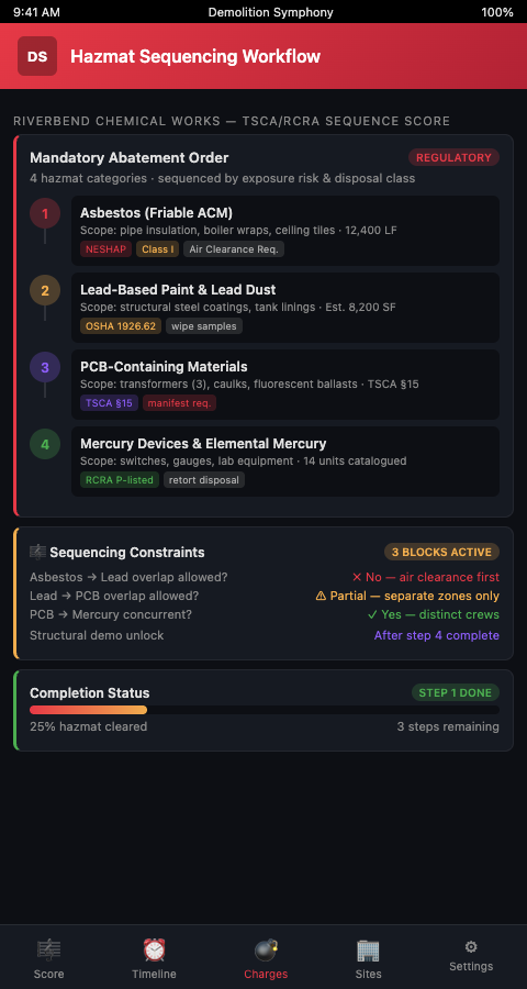 Think of hazmat sequencing as a set of instrument voices that must play before the structural demolition voice can enter. The contamination buffer between abatement and structural work is the rest bar that separates them. Remove that rest, and the voices collide.