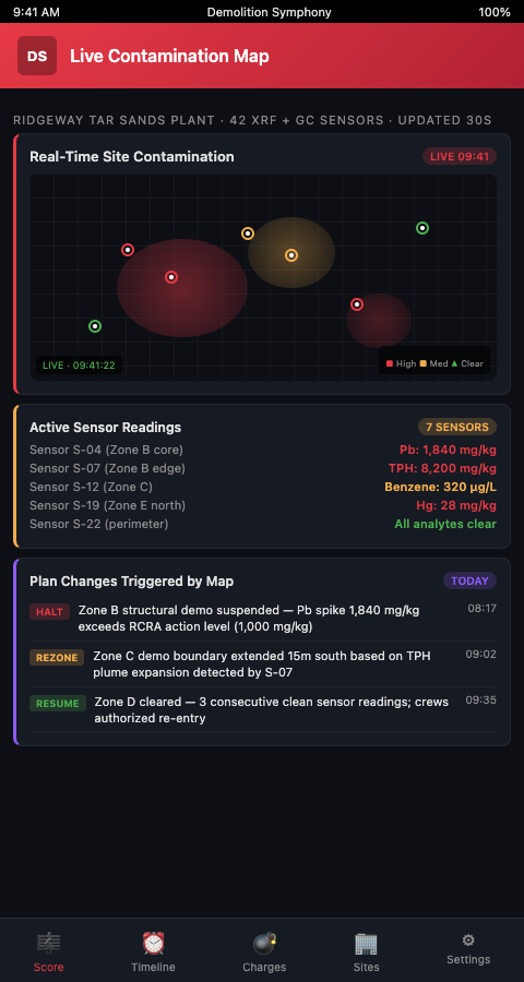 Real-time contamination mapping reshapes demolition plans by closing the gap between condition detection and schedule response. When contamination boundary data flows directly into the Demolition Symphony Planner's score notation, every zone-level condition change generates an immediate scoring adjustment — holding the tempo where expansion is occurring, accelerating where conditions improve, and documenting the complete revision trail for regulatory reference.