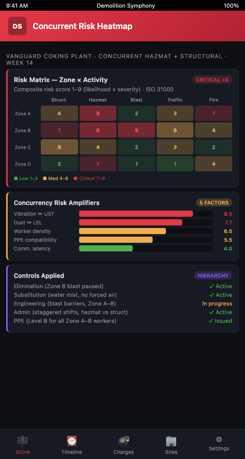 Industrial plant decommissioning crews running simultaneous hazmat and structural operations need a risk model that sees both voices at once. The Demolition Symphony Planner's Hazmat-Structural Interleave Scoring layer notates every zone overlap, flags every compound risk interval, and generates the concurrent operations log your HAZWOPER plan requires. Start your concurrent work risk model today and get every compound hazmat-structural overlap scored and documented before your next permit submittal.