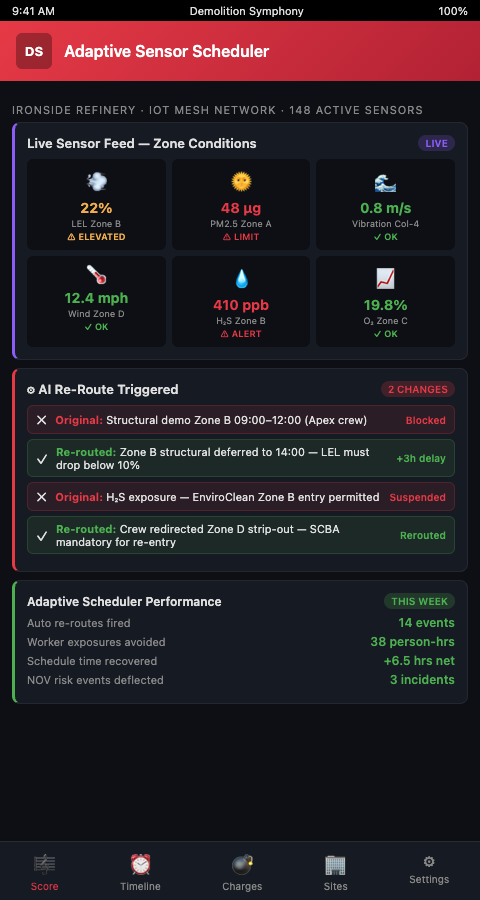 Sensor-driven adaptive decommissioning scheduling closes the gap between what sensors can measure and how that data changes the operational sequence. By integrating IoT data streams directly into the Demolition Symphony Planner score, decommissioning crews move from monitoring dashboards that describe conditions to scheduling systems that adjust to them — automatically holding the tempo in affected zones, presenting scored adjustment options, and building the documentation trail that regulatory compliance requires.