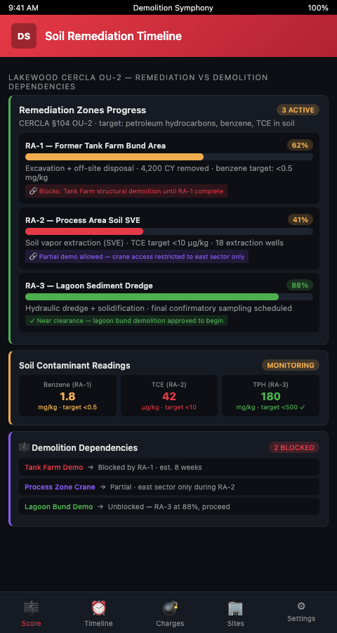 Ready to align your remediation and demolition timelines? Map your contamination zones, remedy selection status, and regulatory hold areas into Demolition Symphony Planner and let the score sequence your decommissioning phases around the remediation reality before the first excavator moves. Start your remediation-integrated schedule today and get every regulatory hold zone mapped into the score before the first demolition crew and remediation excavator compete for the same ground.