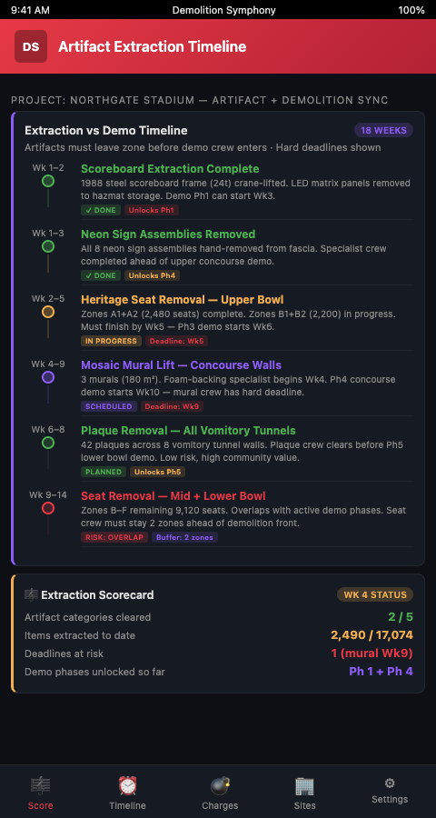 Movement 2 — Clearance Windows with Hard Deadlines. Each zone receives a clearance window — a defined time interval during which artifact extraction must be completed before structural demolition begins in that zone. Clearance windows are sized based on the zone inventory count and the extraction method required, not on an optimistic assumption that "heritage consultants will finish in time." Demolition Symphony Planner flags clearance windows that are undersized relative to inventory count, prompting schedule adjustment before mobilization day.