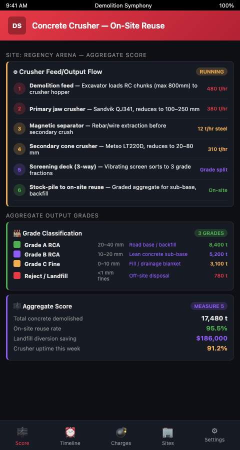 Stadium demolition teams building on-site concrete processing workflows for large venue projects can Score Your Stadium Teardown with Demolition Symphony Planner — the platform that treats concrete crushing and sorting as a first-class operation in the demolition score, with its own timeline, capacity tracking, and phase gates integrated directly into the structural sequencing that drives the entire project. Get started with an on-site crushing workflow that prevents rubble backlog from stalling your demolition front before the first structural bay is broken.