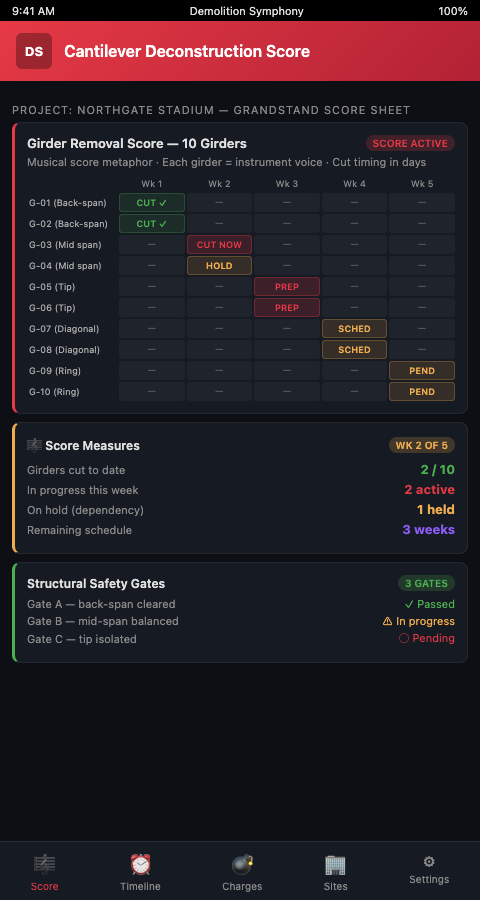 Stadium and arena demolition specialists who have experienced mid-project redesign due to an unsequenced cantilever cut understand the cost: schedule compression, emergency shoring procurement, and in some cases, complete re-sequencing of the demolition plan. The score prevents that redesign by making the structural logic and visual demolition score planning explicit before mobilization. Score Your Stadium Teardown with Demolition Symphony Planner and build a grandstand removal plan that translates engineering analysis into crew-level notation. Get started now and bring cantilevered grandstand deconstruction scoring into your next large venue project before mobilization day.