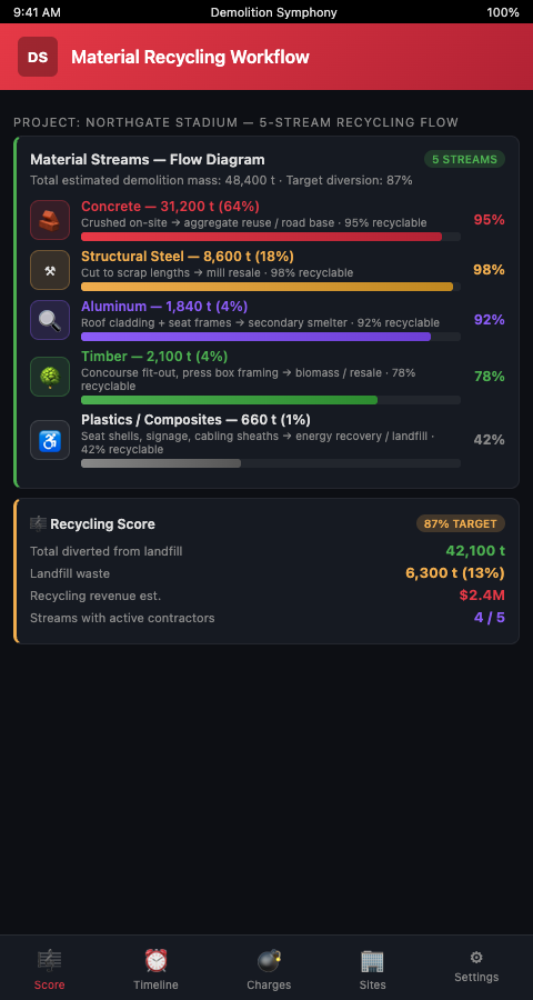 Score Your Stadium Teardown with Demolition Symphony Planner and build a material recycling workflow that runs as a scored parallel track alongside your structural demolition sequence — keeping every material stream on beat from the first cut to the final transport.