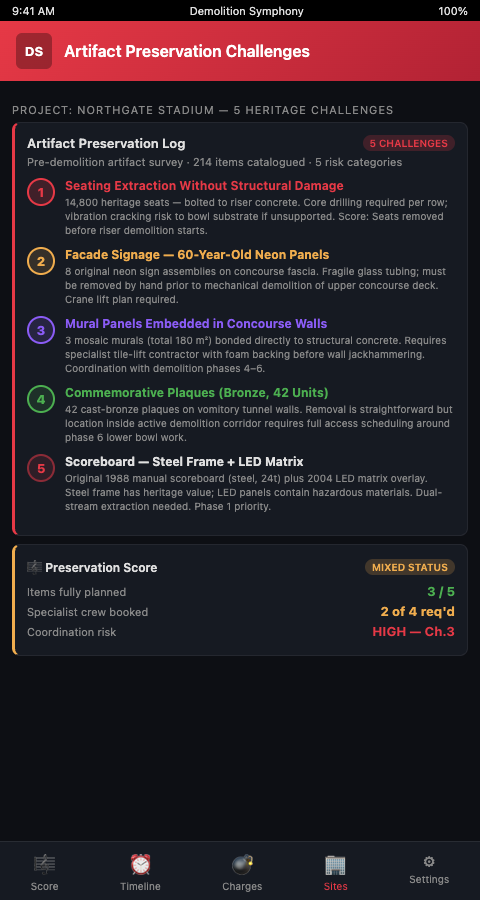 Score Your Stadium Teardown with Demolition Symphony Planner and build an artifact preservation plan that treats every historic item as a voice in the demolition score — one that deserves its own rest period before the structural movement begins. Get started with a pre-mobilization artifact inventory that assigns every heritage item a disposition status and a scored extraction window before structural demolition begins.