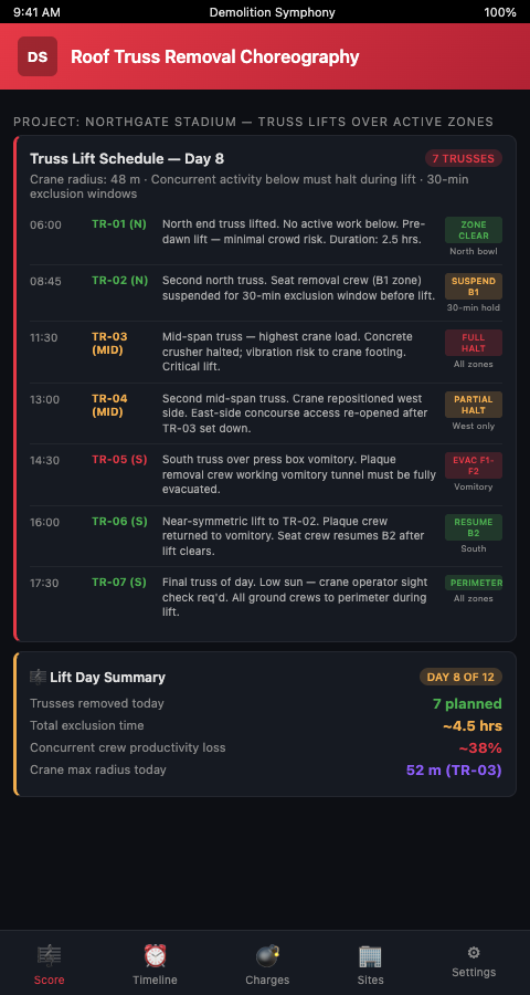 The scored choreography approach in Demolition Symphony Planner achieves both goals: the safety of a fully engineered sequence and the efficiency of parallel operations where the load analysis confirms they're safe. Every truss removal measure is backed by member condition data, lift plan calculations, and exclusion zone geometry. Every ground-level crew works from a score that shows them exactly when their zone is safe to occupy. Score Your Stadium Teardown with Demolition Symphony Planner and bring every truss down in the right order, at the right time, with every worker in the right place.