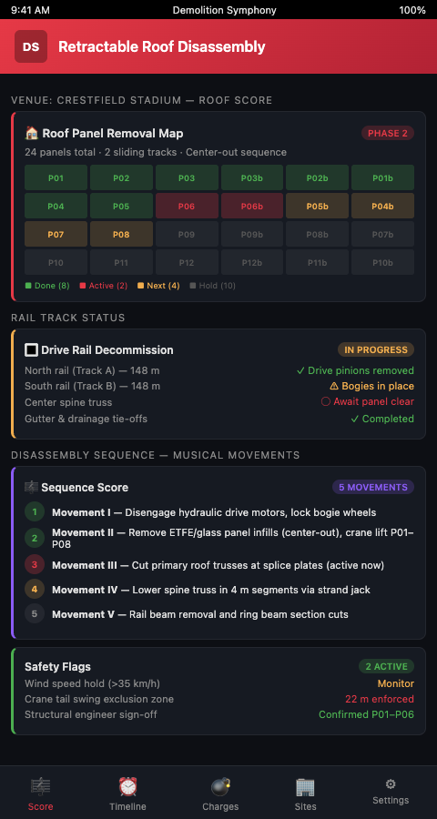 Demolition Symphony Planner scores retractable roof disassembly as a multi-phase preliminary movement that precedes and enables the primary roof truss removal sequence: every salvage window, recycling stream, and structural cut becomes musical notation on a visual demolition score, and the mechanical disassembly measures run as a distinct staff before the structural staff begins. No structural lift can be scored until all mechanical disassembly measures in the same roof bay are marked complete.