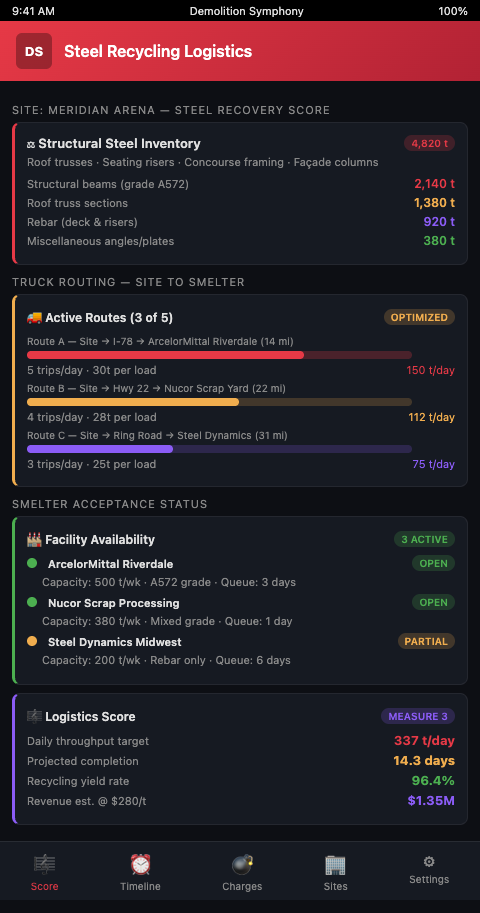 Movement 3 — Transport Cadence Coordination. Scrap steel removal stadium deconstruction projects fail their transport economics when trucks arrive on-demand rather than on schedule. Demolition Symphony Planner generates a transport dispatch schedule based on production rate projections — how many tons of each grade will be generated per shift — and coordinates truck dispatch with recycler receiving windows. Coordinated dispatch with pre-confirmed receiving windows is the primary logistics lever for reducing the per-ton transport cost on large demolition projects — because mills and processors optimize their intake scheduling around predictable delivery volumes, not variable on-demand arrivals.