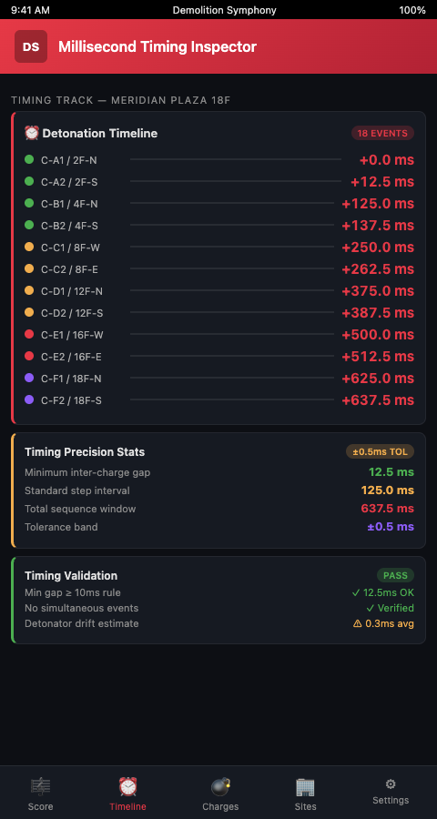 Urban high-rise implosion coordinators operating in dense city environments — where neighboring structures sit within 50 meters of the blast perimeter — cannot afford to discover timing interaction errors during detonation. The visual score approach in the Demolition Symphony Planner makes the full timing sequence auditable before the licensed blaster signs off on the network design.