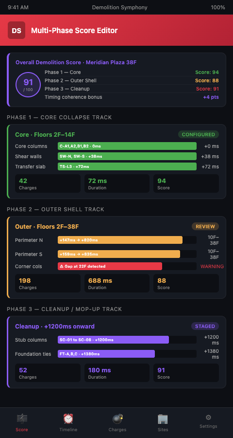 Urban high-rise implosion coordinators managing buildings with complex structural cores — C-shaped, coupled-wall, or core-and-outrigger systems — need a planning tool that treats the core as a primary structural variable rather than a secondary annotation. The Demolition Symphony Planner's multi-phase core scoring gives coordinators the visual control over core sequencing that complex high-rise demolition requires. Join the waitlist to bring phased core scoring into your next project's planning workflow.